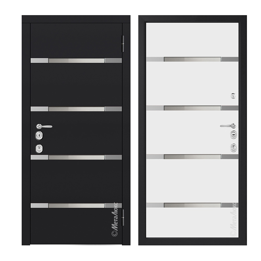 Внешняя панель: Фрезерованная влагостойкая панель МДФ высокой плотности 16 мм, эмаль, цвет на выбор, стеклопакет (пескоструй), черные металлические вставки